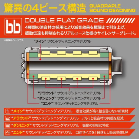 14mm逆ネジに対応したサイレンサーです。吸音スポンジのみの商品と異なり、LayLax独自の4重減音構造「DOUBLE FLAT GRADE」の採用により吸音パイプからサイレンサー外装部への振動伝達も抑制。高い減音効果を発揮します。