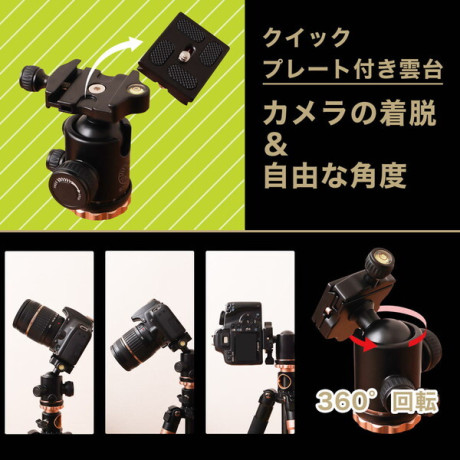 360°なめらかに回転するボール式自由雲台で、思ったとおりの角度でカメラを固定できます。
