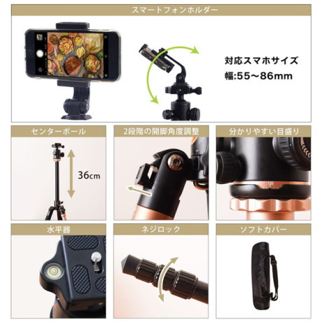 * セット内容:三脚、収納ケース、六角レンチ2本、雲台カバー、ベルトポーチ、スマホホルダー、日本語取扱説明書