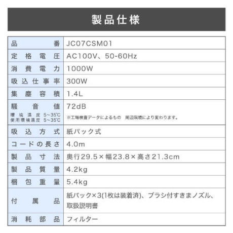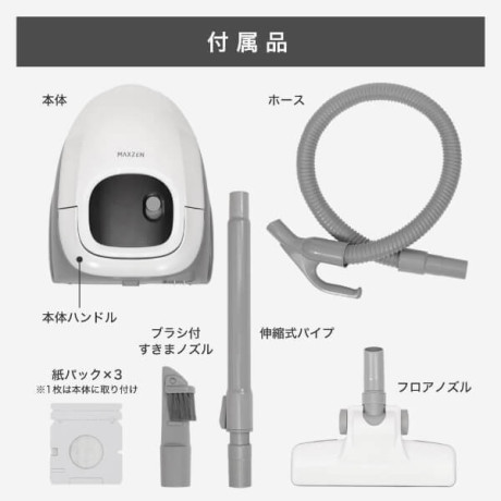* 付属品: 紙パック×3(1枚は装着済)、ブラシ付すきまノズル、取扱説明書