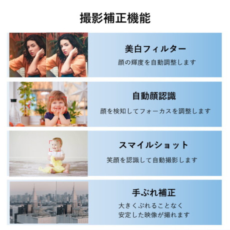 ★ 美白フィルター、顔検出、スマイルショット、手ぶれ補正など充実な機能が付いています。