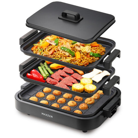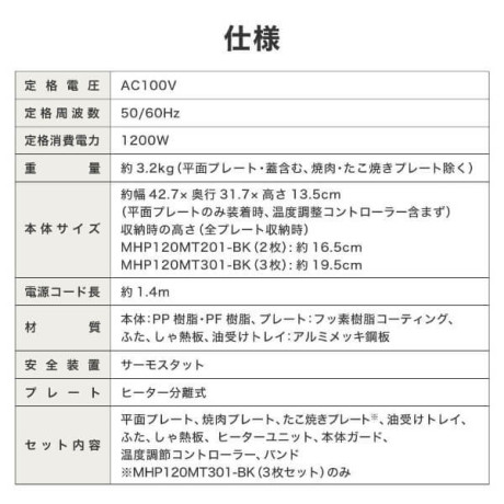 * セット内容: 平面プレート、 焼肉プレート、 たこ焼きプレート、油受けトレイ、ふた、 しゃ熱板 ヒーターユニット、 本体ガード、温度調節コントローラー、バンド