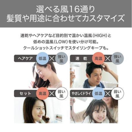 ★ 髪をいたわりながら乾かしたい時は低温(LOW)×強い風(TURBO)、早く乾かしたい時は高温(HIGH)×強い風(TURBO)など、目的に合わせてお好みの風に調節することが可能です。