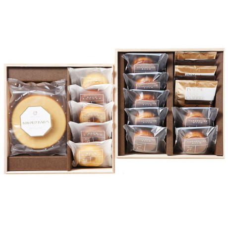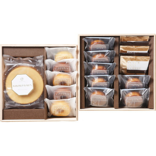 * バウムクーヘン(北海道産生乳100%の生クリーム使用)(14.3φcm)×1、ミニバウム(バニラ×3・チョコ×2)、キャラメリゼバウム(プレーン×4・ストロベリー×3)、ドリップコーヒー8g×5(2段重ね)