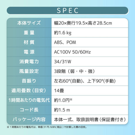 * 1時間あたりの電気代: 約1.0円※