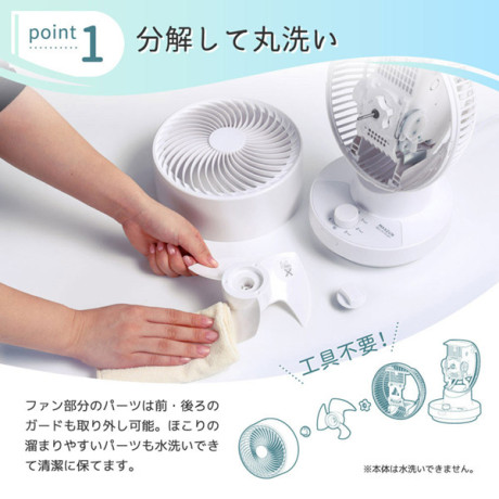 ファン部分のパーツは前・後ろのガードも取り外し可能。ほこりの溜まりやすいパーツも水洗いできて清潔に保てます。