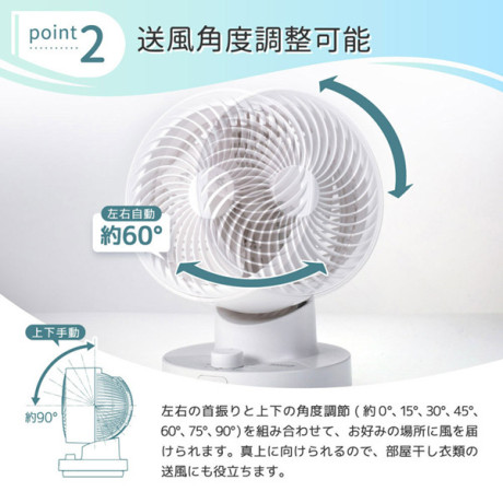 左右の首振りと上下の角度調節(約0°、15°、30°、45°、60°、75°、90°)を組み合わせて、お好みの場所に風を届けられます。