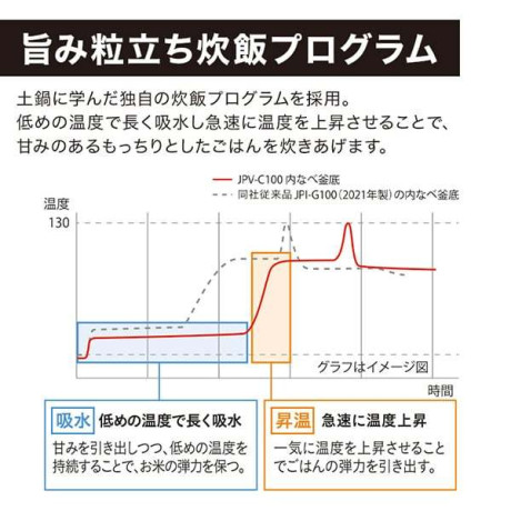 給水は低めの温度で長く吸水することで、米がだれることなく弾力を保ち、昇温は一気に温度上昇させることで、ごはんの弾力を引き出します。