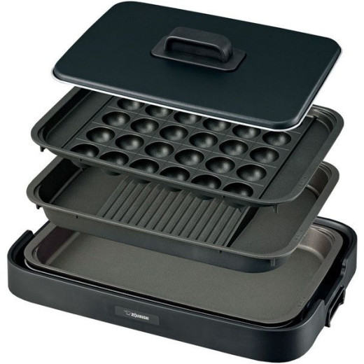 「深型プレート」「傾斜溝つき 焼肉プレート」「区切り線つき たこ焼きプレート」付きホットプレート。