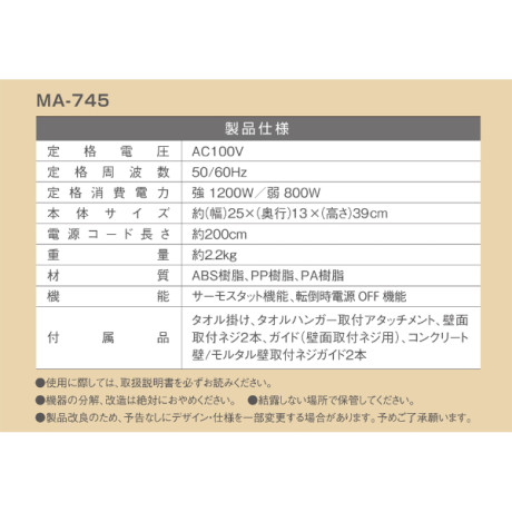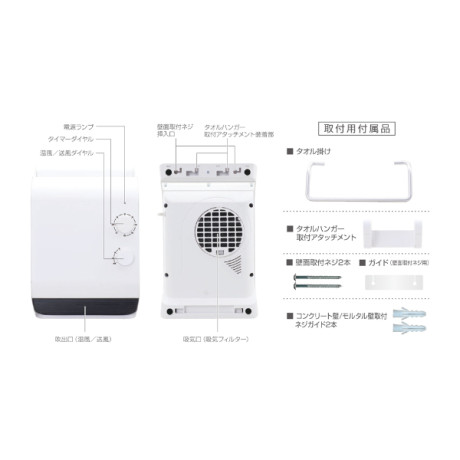 * 付属品:タオル掛け、タオルハンガー取り付けアタッチメント、壁面取り付けネジ2本、ガイド(壁面取り付けネジ用)、コンクリート壁・モルタル取り付けネジガイド
