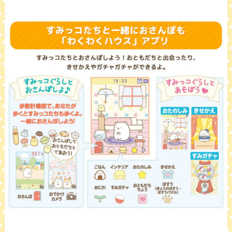 カメラやゲーム、歩数計、スケジュール帳など、すみっコぐらしのかわいいアプリが56種搭載!