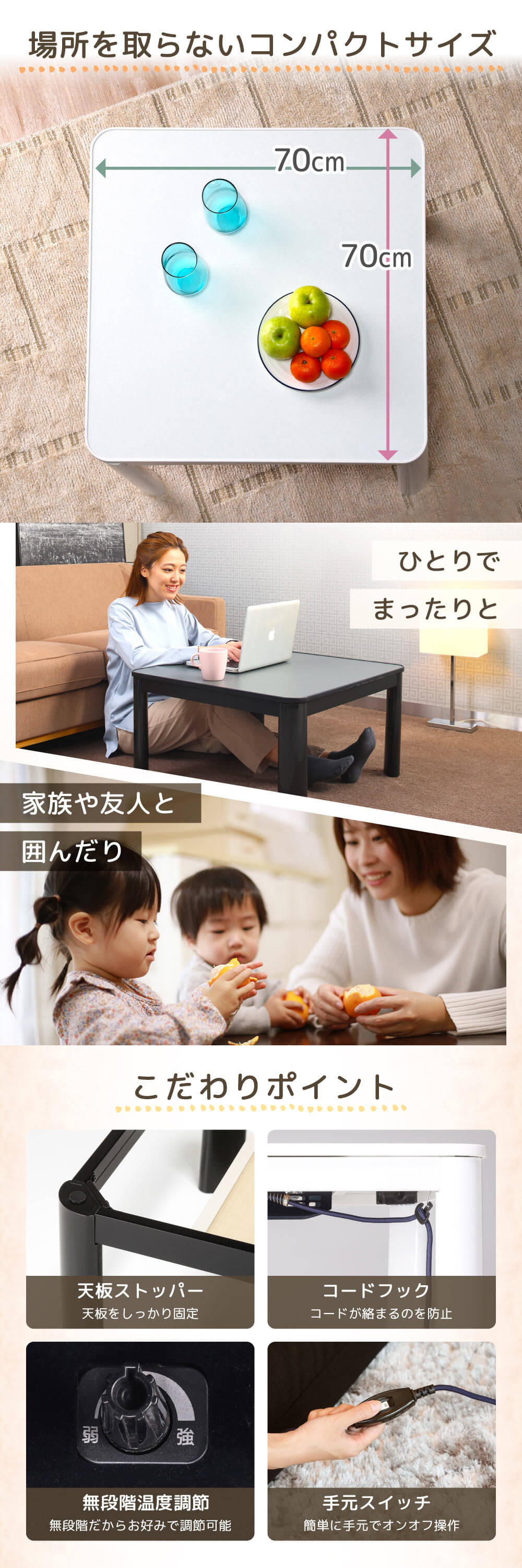※2~4の使用環境は、室温20℃、縦75cm×横75cm×高さ34cmのこたつに厚さ5cmのふとんを掛け、人が入らない状態で5時間運転させたときの値です。実際の使用状況や使用環境によって変わります。