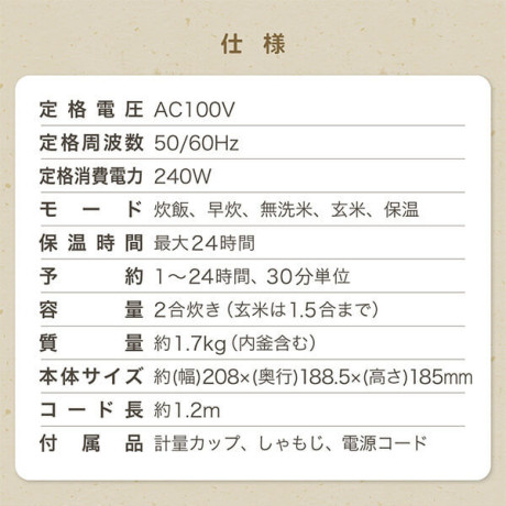* 付属品: 軽量カップ×1、しゃもじ×1、電源コード×1、取扱説明書(保証書)