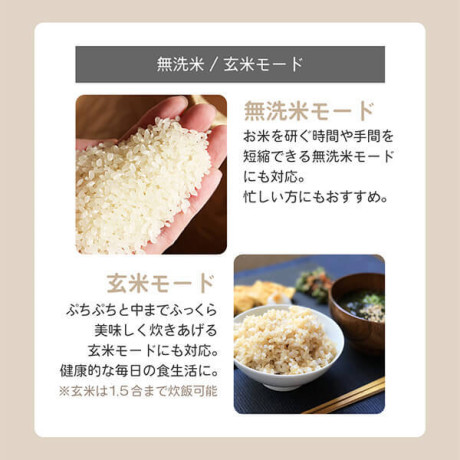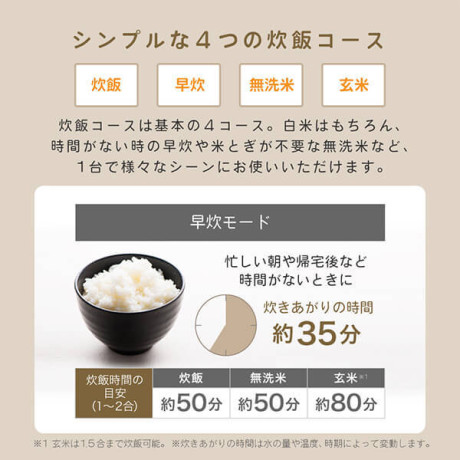 白米はもちろん、時間がない時に早炊きや米とぎ不要な無洗米など、1台で様々シーンにお使いいただけます。