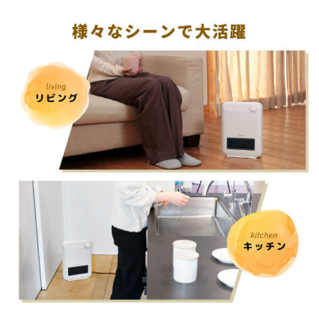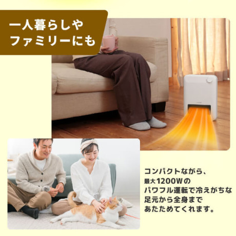 コンパクトながら、最大1200Wのパワフル運転で冷えがちな足元から全身まであたためてくれます。