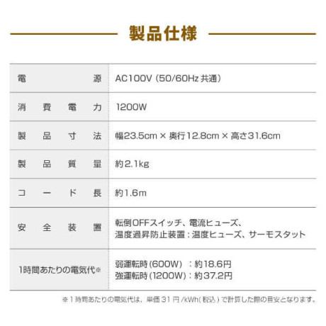 * 1時間あたりの電気代※弱運転時(600W):約18.6円、強運転時(1200W):約37.2円