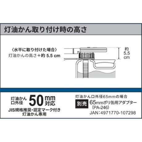 ★ 安心のピッタリ満タン自動停止機能付き★ 満タンになるとブザーでお知らせ★ 単三電池4本使用(別売)★ ベランダコンテナ収納BOXに収納出来ます。(内寸約413mm以上)※注意・新品アルカリ乾電池をご使用下さい。・給油中はその場を離れないで下さい。・本製品はストーブ側燃料タンクの給油口の内径22ミリ以上に使用可能です。給油口サイズをよくご確認下さい。* 吐出量:約8L/分* 使用温度範囲:約-5℃~+45℃