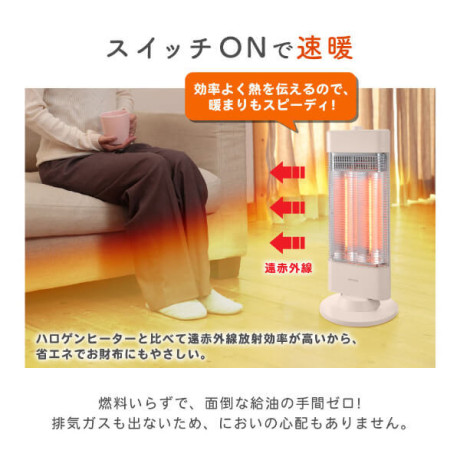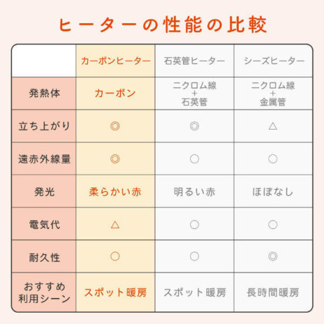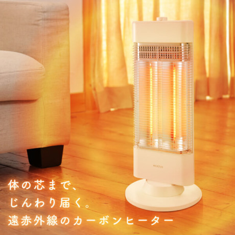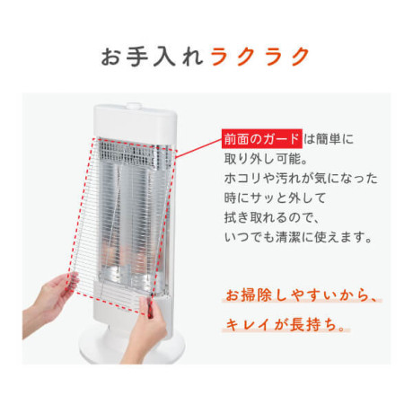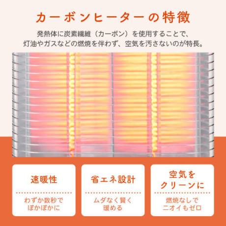 発熱体に炭素繊維(カーボン)を使用することで、灯油やガスなどの燃焼を伴わず、空気を汚さないのが特長。