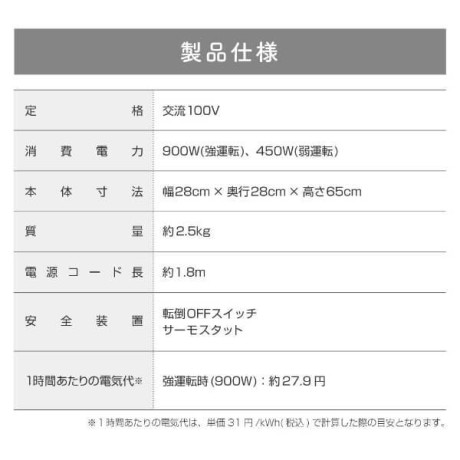 * 安全装置: 転倒OFFスイッチ、サーモスタット