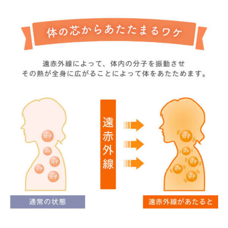 遠赤外線によって、体内の分子を振動させその熱が全身に広がることによって体をあたためます。
