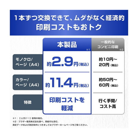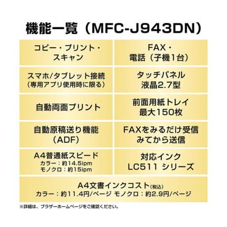 * A4文書インクコスト(カラー/モノクロ): 約11.4円(税込)/2.9円(税込)