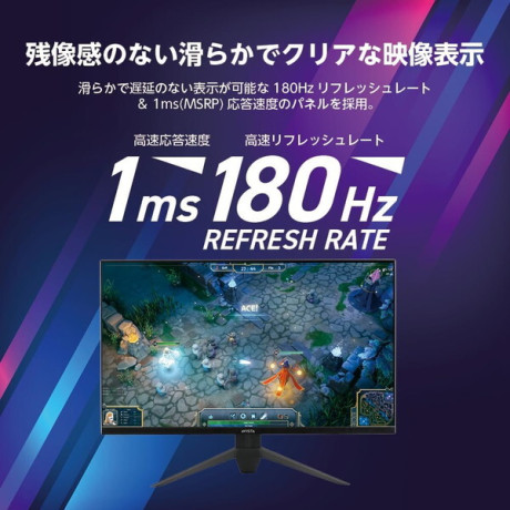 滑らかで遅延のない表示が可能な180Hzリフレッシュレート&1ms(MPRT)応答速度のパネルを採用。FPSやアクション、レーシングなどのeスポーツタイトルにおいて画面表示と瞬時にリアクションを取ることで素早く対応できるようになります。