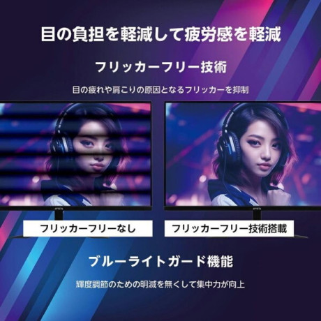 集中できるコンディションを維持するためには目の疲れや肩こりの原因を抑えることが欠かせません。 ブルーライトを大幅に抑えることができる「ブルーライトガード機能」と、輝度調節のための明滅を発生させない「フリッカーフリー技術」を搭載。プレイヤーの快適さを向上させて集中力の向上に寄与します。