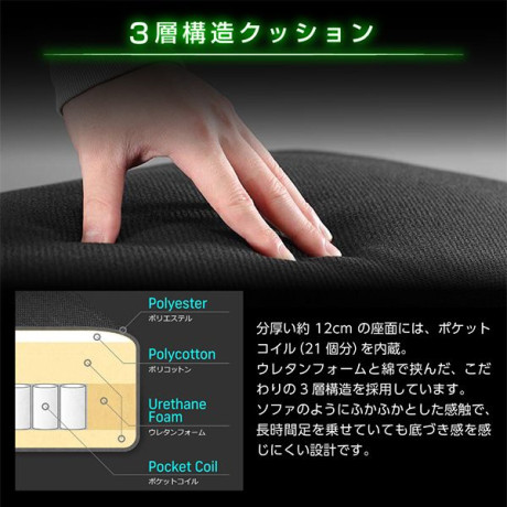 分厚い約12cmの座面には、ウレタンフォームと綿で挟んだ、こだわりの3層構造を採用しています。