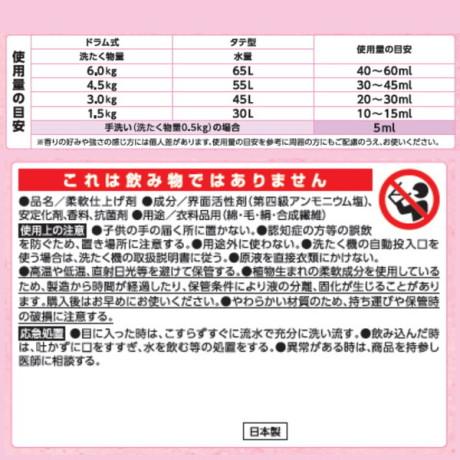 * 成分: 界面活性剤(第四級アンモニウム塩)、安定化剤、香料、抗菌剤