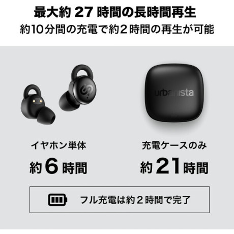 イヤホン単体で最長6時間の連続再生、ケース併用でさらに21時間、合計最大27時間のリスニングが可能