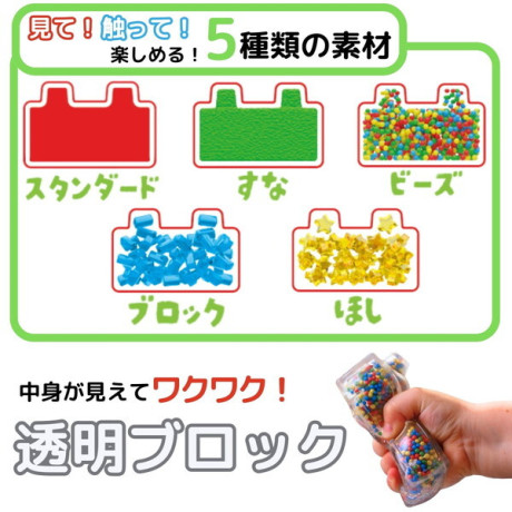 カラフルで透明なブロックの中には、スタンダード・砂・ビーズ・ブロック・星型の全5種類の素材が入っており、子どもがわくわくすること間違いなし!