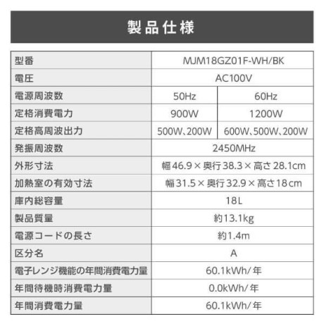* 電子レンジ機能の年間消費電力量: 60.1kWh/年